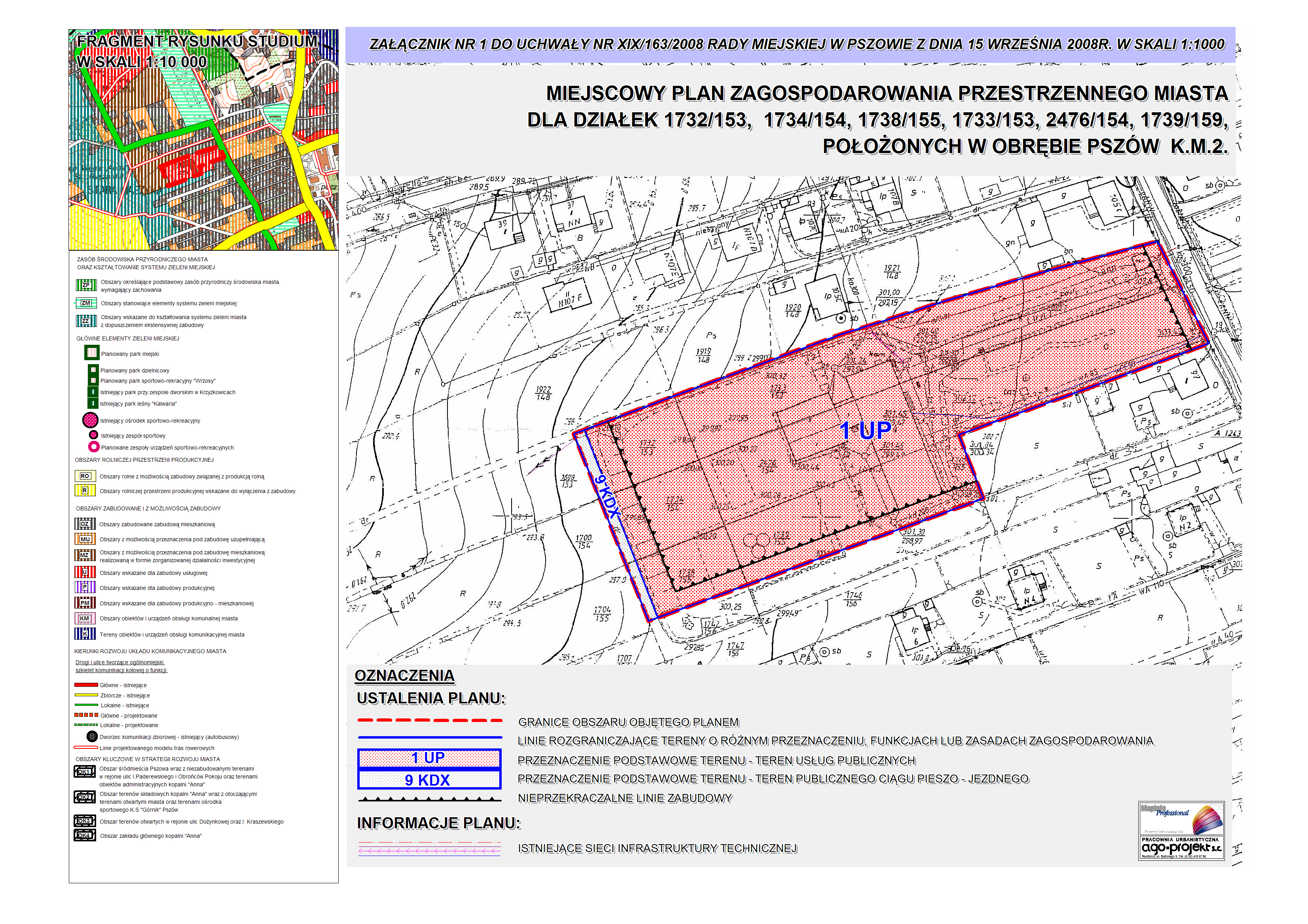 Uchwała Nr XIX/163/2008 Rady Miejskiej w Pszowie z dnia 15 września 2008 r. w sprawie: 1. stwierdzenia zgodności przedłożonego przez Burmistrza Miasta Pszów projektu planu z ustaleniami Studium uwarunkowań i kierunków zagospodarowania przestrzennego miasta Pszowa, 2. uchwalenia miejscowego planu zagospodarowania przestrzennego miasta dla działek 1732/153, 1734/154, 1738/155, 1733/153, 2476/154, 1739/159, położonych w obrębie Pszów k. m. 2.